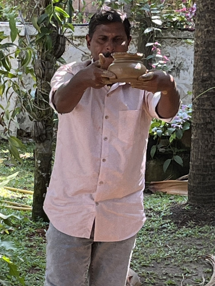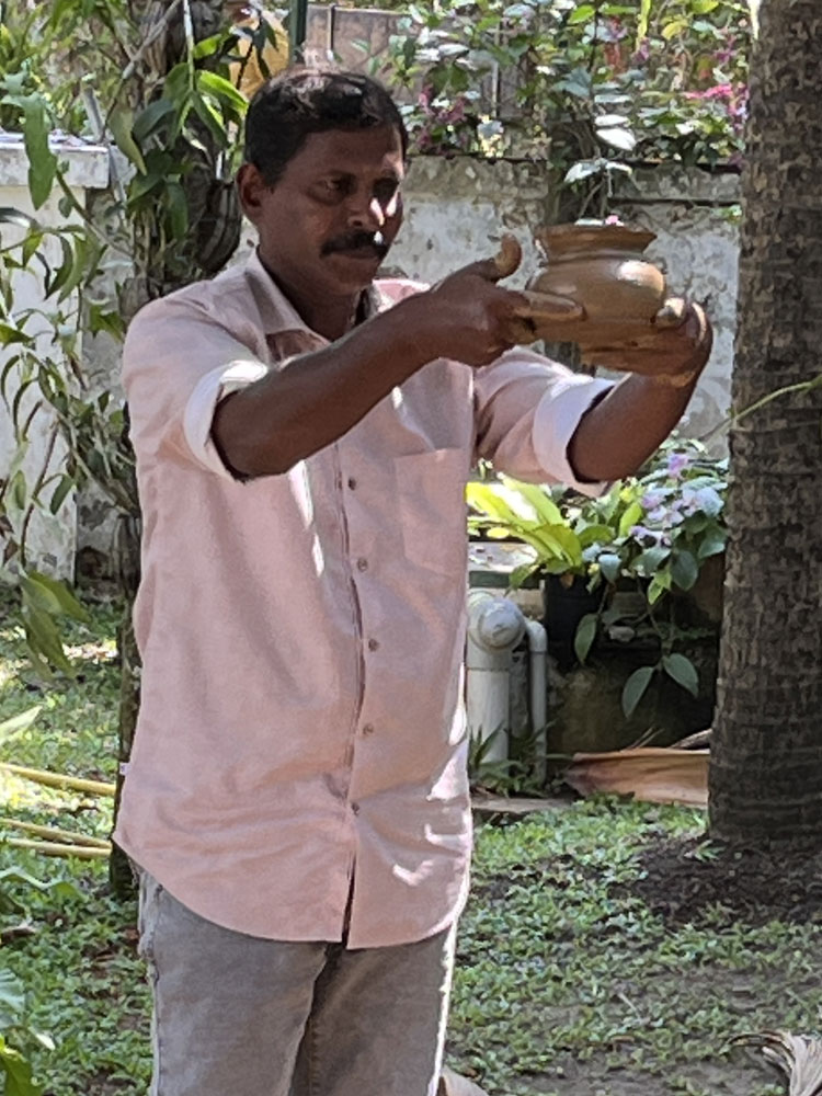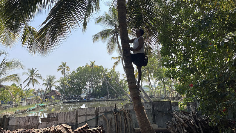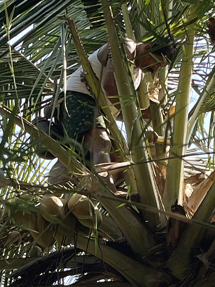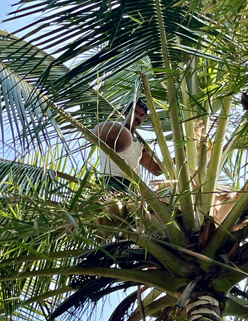 A skilled toddy tapper climbs the palm tree, usually barefoot,