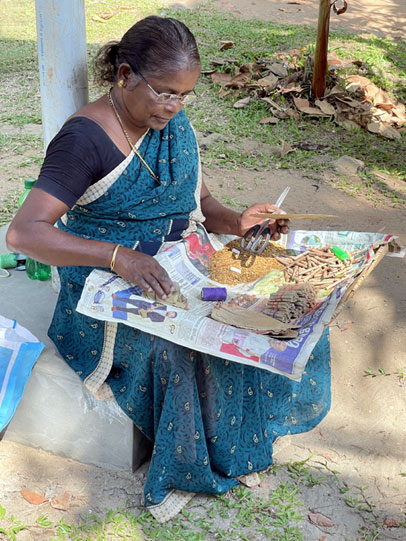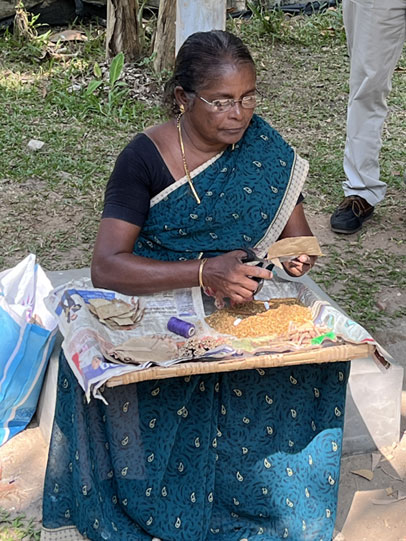 lady can be seen cutting a tendu leaf to size, putting