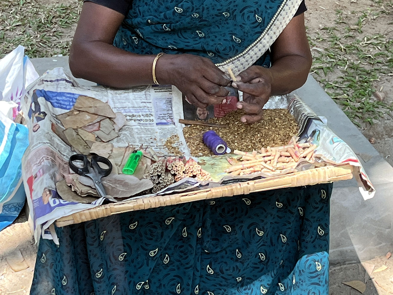 lady can be seen cutting a tendu leaf to size, putting