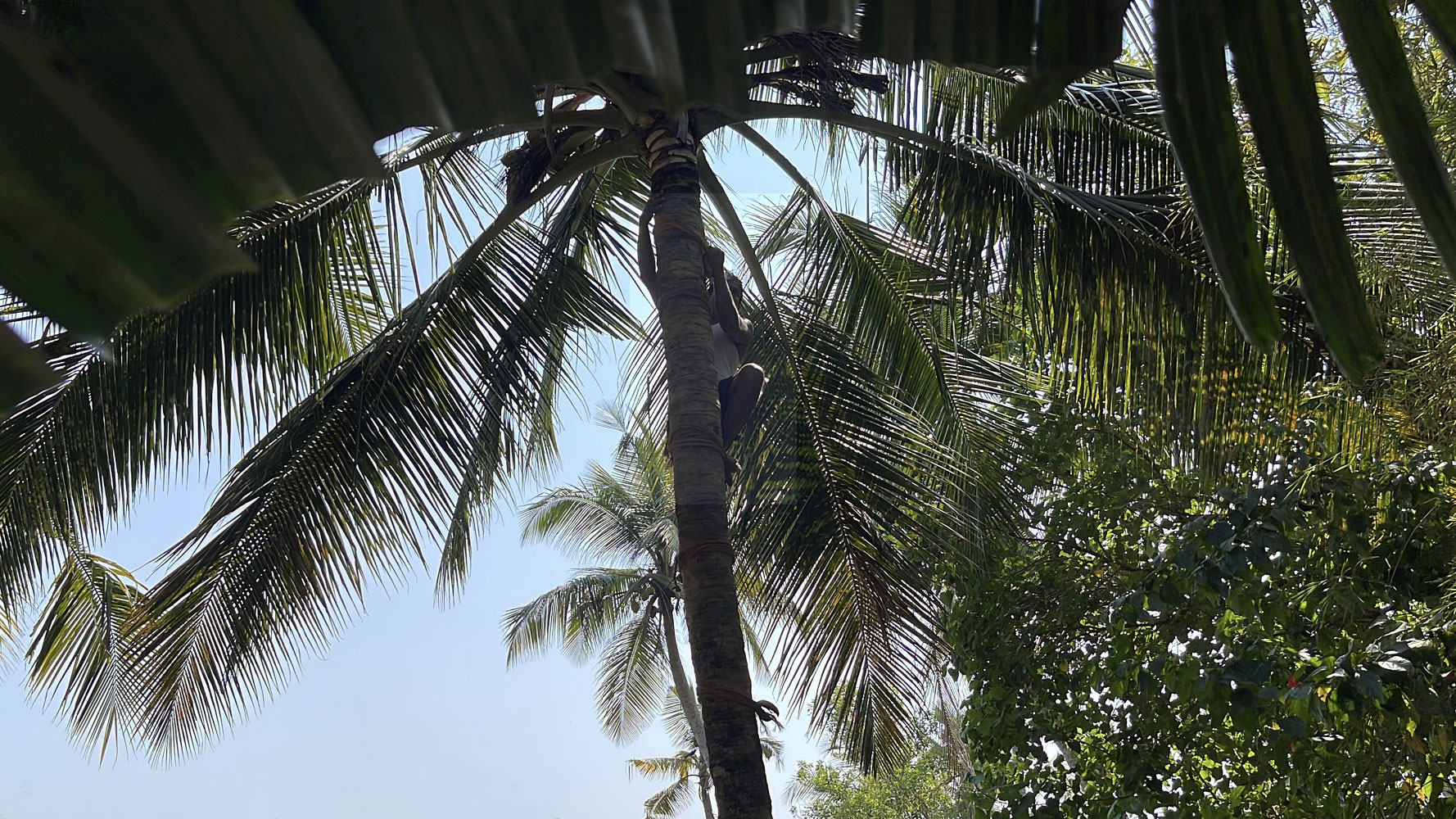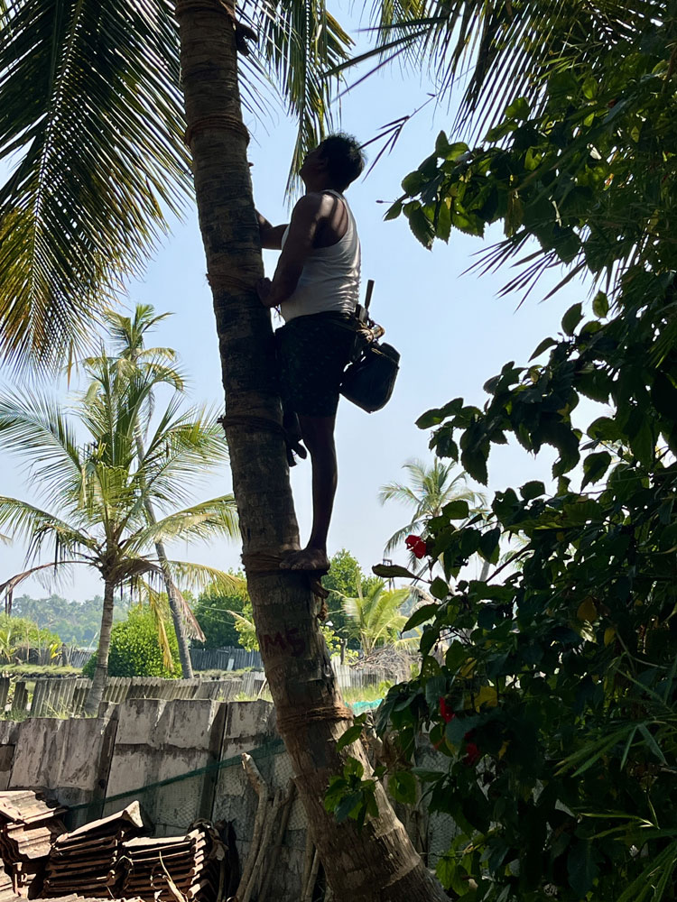 A skilled toddy tapper climbs the palm tree, usually barefoot,