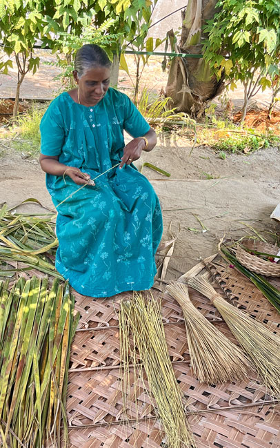 of coconut leaves are taken out and tied together into brooms. |